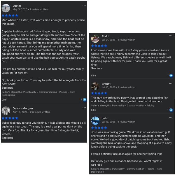 Had a great day on the water with Capt Josh. It is obvious he loves what he does and his passion to catch fish is contagious. The bite was off and on but Josh continued to find spots to give us chances to hook up. We took a little break and watched the Blue Angels which was awesome! Josh ended up staying out a couple hours past our scheduled time to make sure we caught more fish. We went home with some great memories and a cooler full of fresh fillets for dinner! Highly recommend Josh and Skunk Fishing! Highly recommend bay/inshore fishing over deep sea/outshore fishing! A lot more fishing and less “boat riding”. We will be back next summer and hope to get out on the water with Josh again!